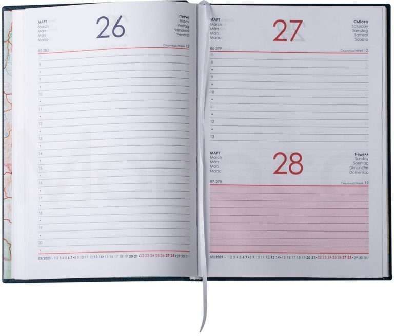 • Календар-бележник с двуцветен печат, 5 езика и 16 страници полезна информация, лента за отбелязване