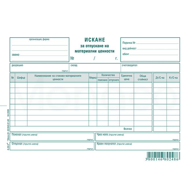 Искане за отпускане на материални ценности, 8 реда