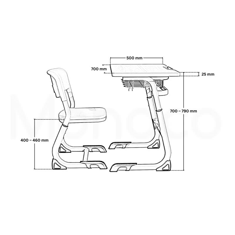 - Стол: метална основа с електростатично прахово боядисване (ESPC) в тъмно сив цвят (графит), регулируем в диапазон 400 - 460 mm.